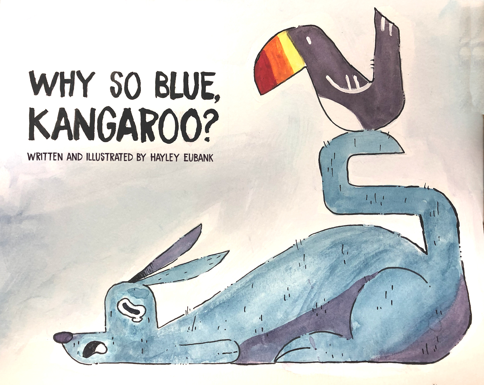 This watercolor illustration was created for the Book Illustration course at the Art Institute of Dallas. Everything was colored and inked by hand. I was randomly assigned an animal to anthropomorphize, which was the kangaroo. Playing off a fun rhyme, I intended this book to help children cope with grief or any unfortunate time in their lives and let them know that their feelings are valid. It's okay to be sad, and it will all pass in time.